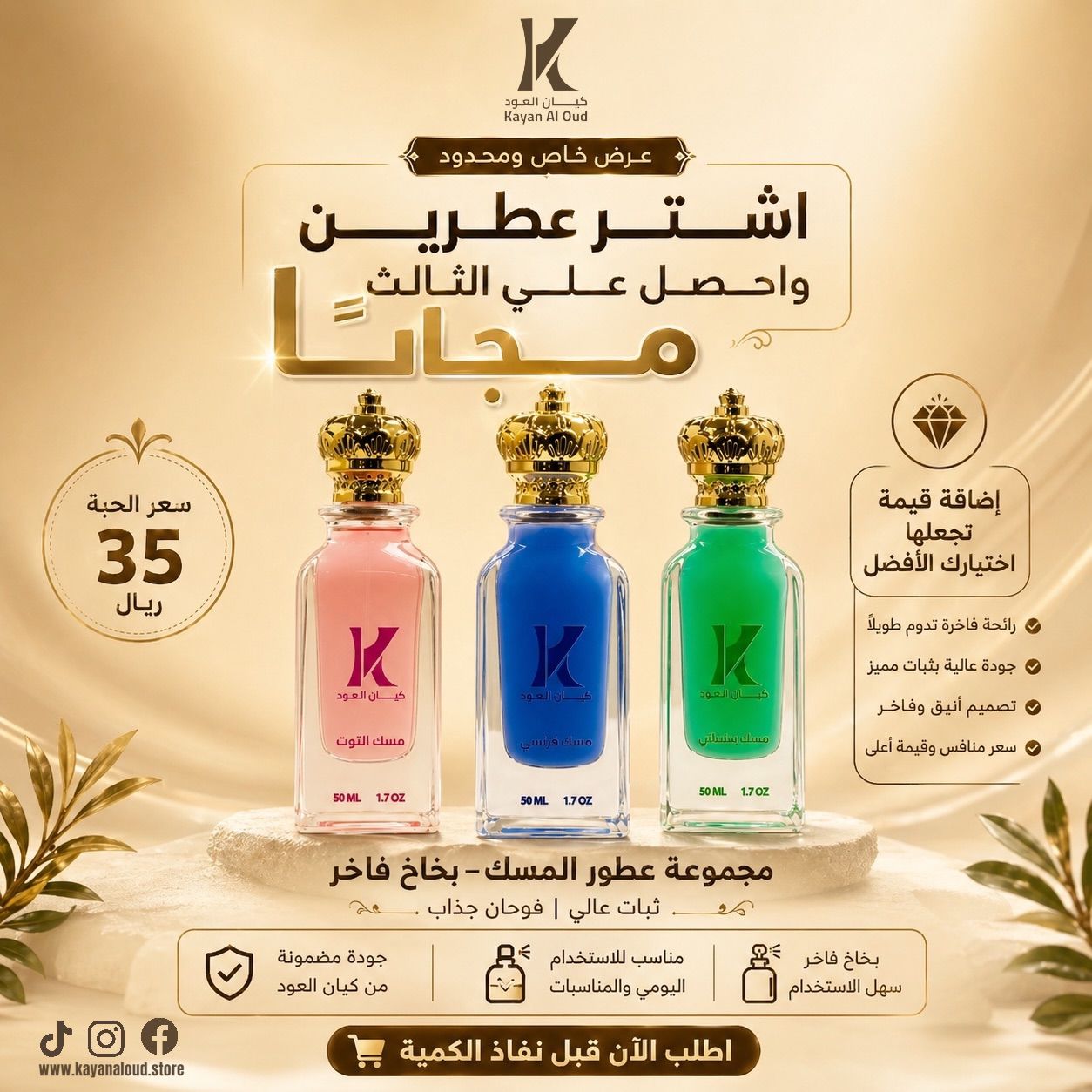 باقة المسك (2+1 مجاناً)٧٠٫٠٠١٠٥٫٠٠وفر ٣٥٫٠٠المواصفاتجاري تحميل تفاصيل الباقة...تفاصيل المنتجالتقييمات
